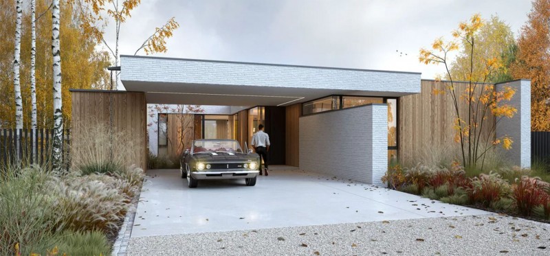 Крытая парковка на два автомобиля подходит к входной группе. Большой холл имеет панорамное остекление и необычную зону хранения в центре комнаты.